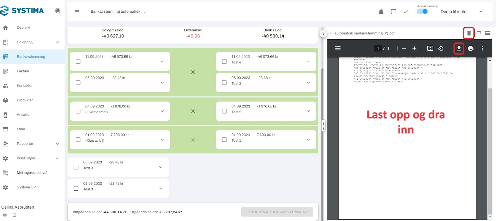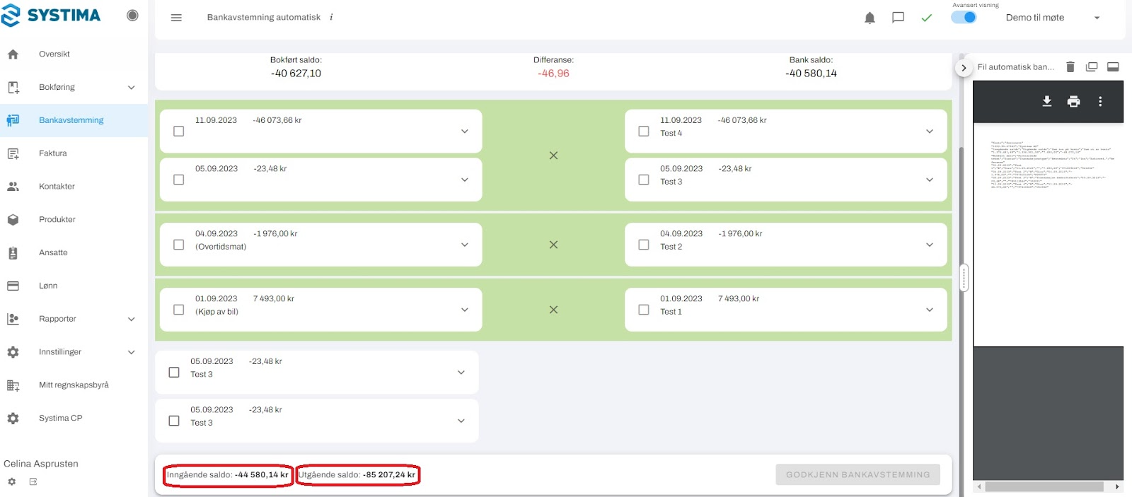 Dersom du har noen poster som er markert med grønt, betyr det at disse postene er avstemt. Du kan avstemme venstre og høre side mot hverandre, og det er også mulig å avstemme en side alene.