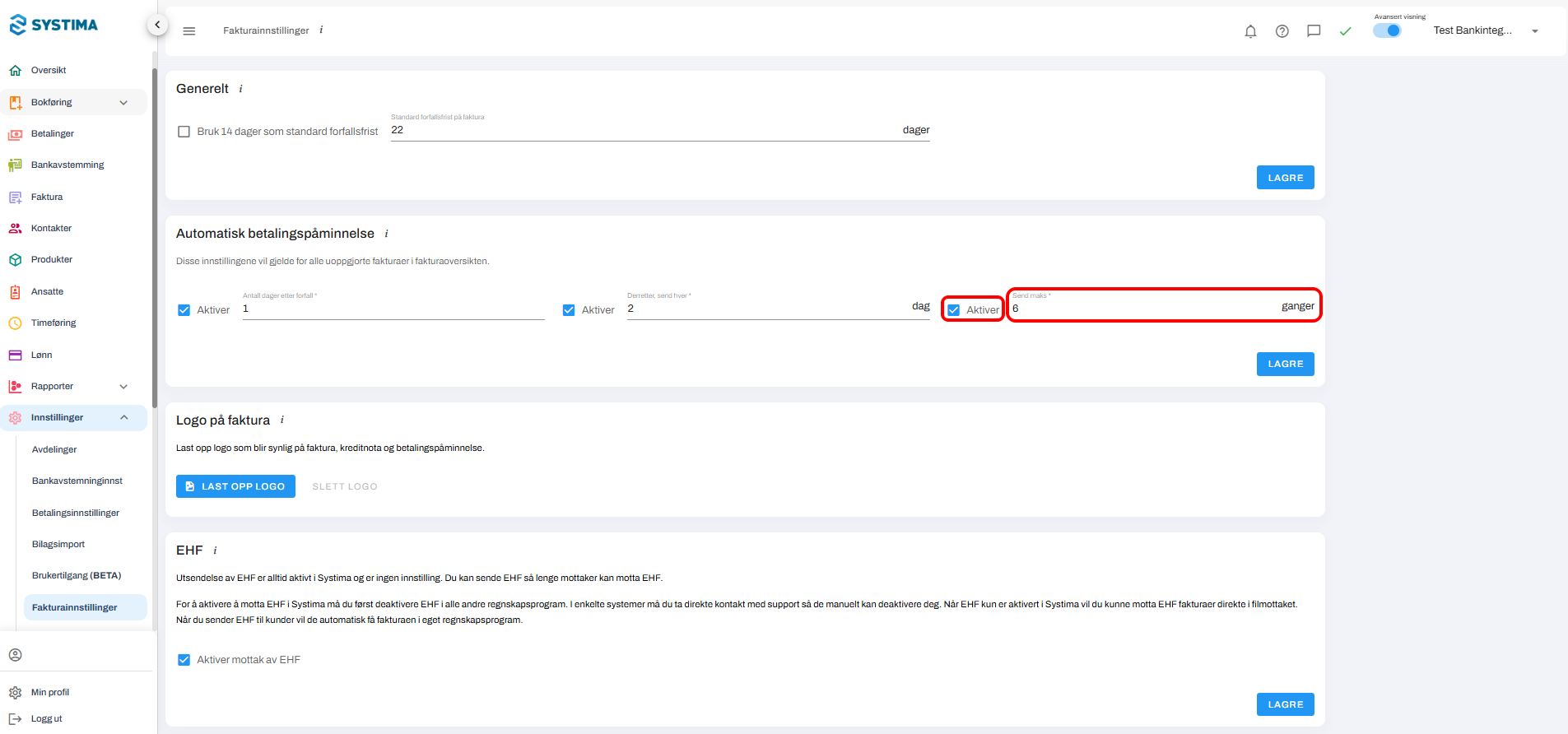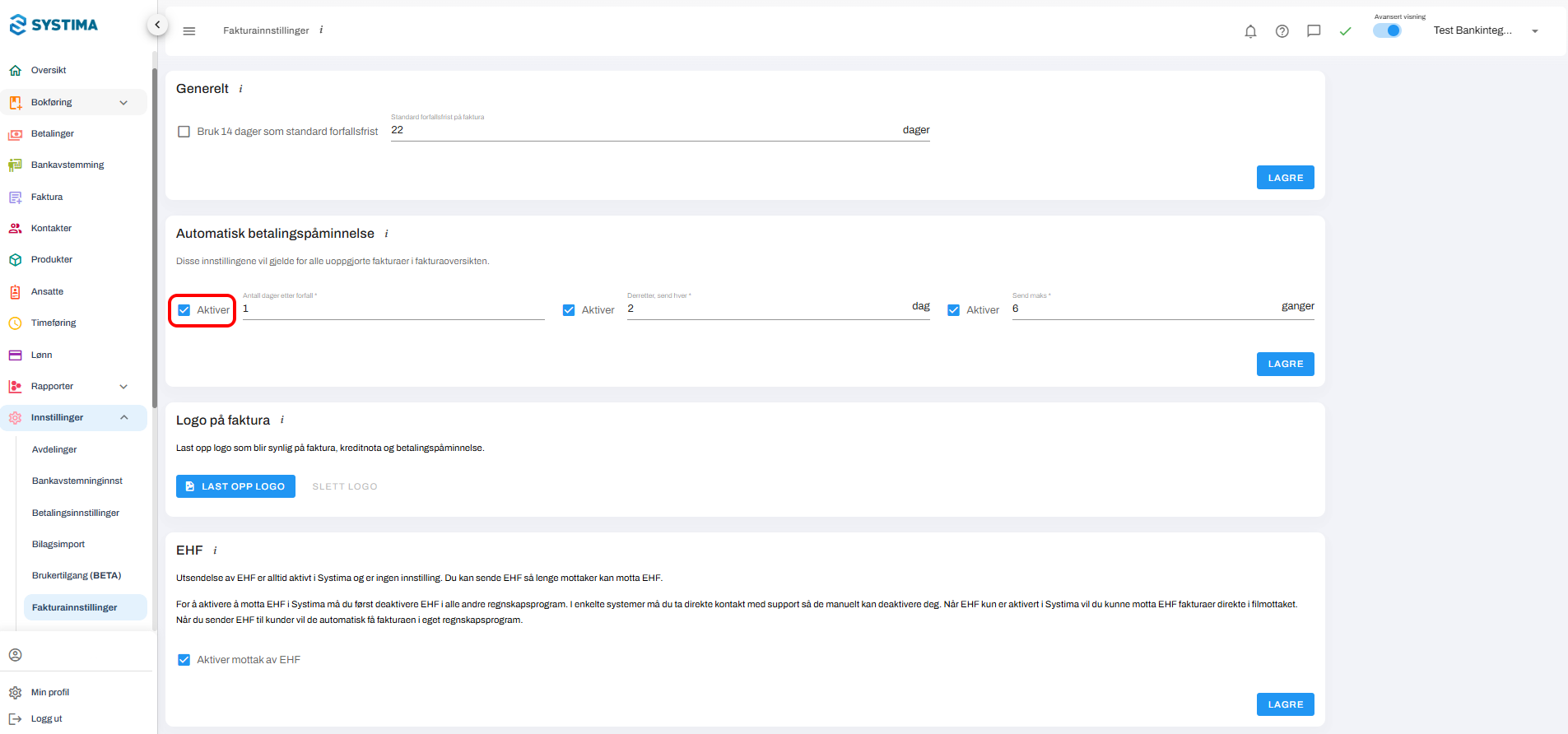 Når man trykker i firkanten for Aktivering av betalingspåminnelse vil du se boksen blir blå.