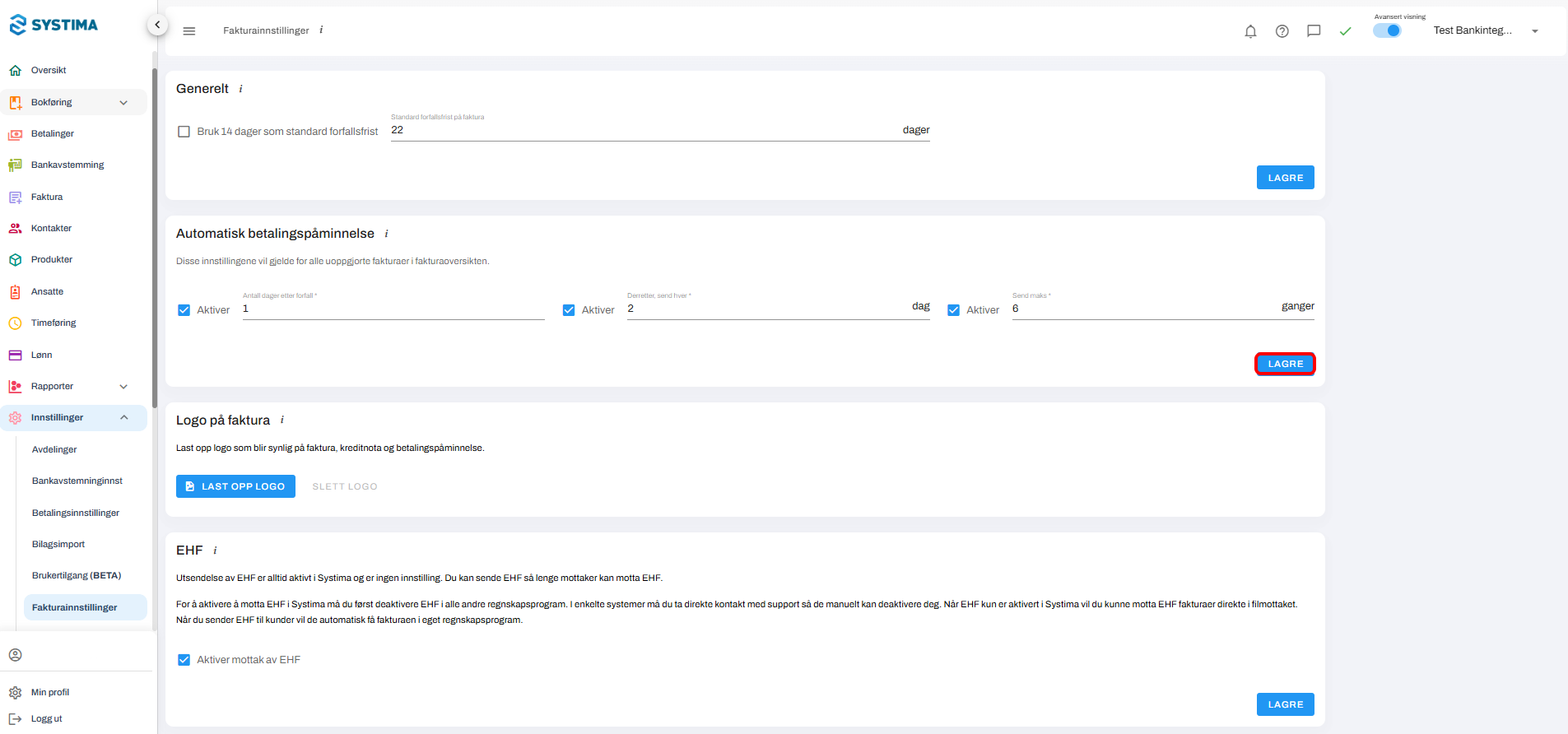 I menyen til venstre velger du Innstillinger -> Fakturainnstillinger.