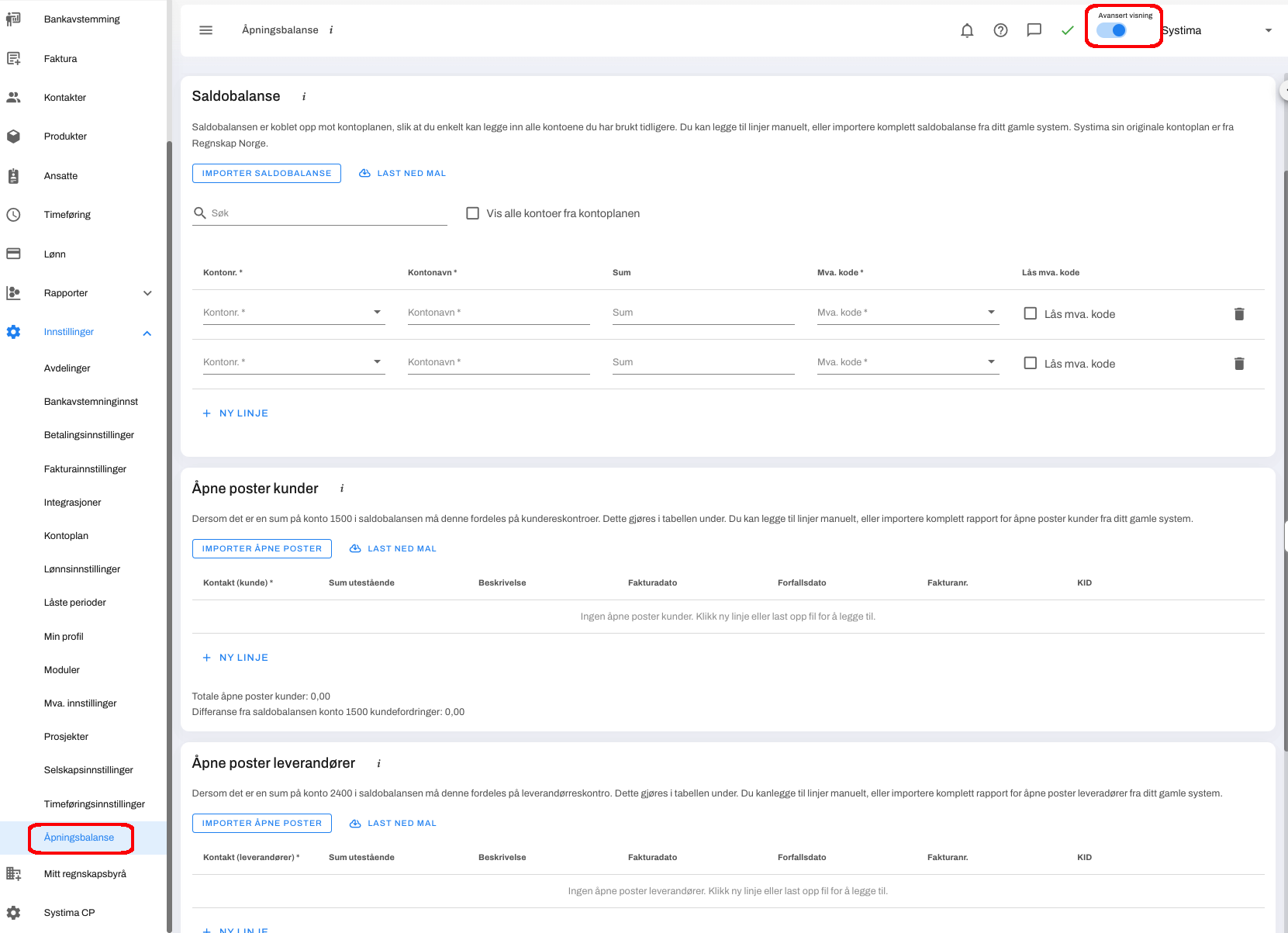 5: Gå til Systima og velg Innstillinger -> Åpningsbalanse i menyen (dette vises kun i avansert visningsmodul). Deretter klikk på "Importer åpne poster"