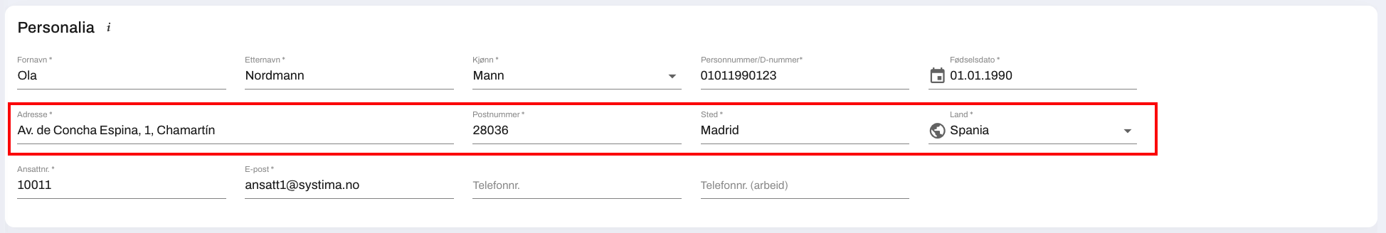 I kortet "Personalia" på ansattprofilen er det viktig å fylle inn korrekt adresse, postnummer, sted og land.