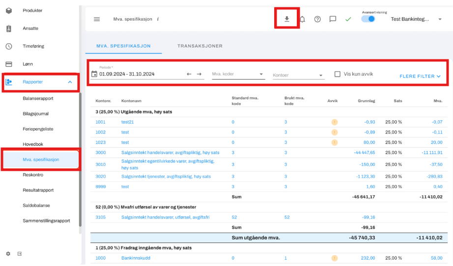 MVA-spesifikasjonen gir en detaljert oversikt over kontoer og tilhørende MVA-koder som er benyttet. Øverst i rapporten finner du flere filtre som kan brukes sammen for å tilpasse rapporten. Her kan du filtrere etter periode, mva. koder, kontoer og vis kun avvik. Klikk på «Flere filtre» øverst til høyre for å vise alle alternativene.