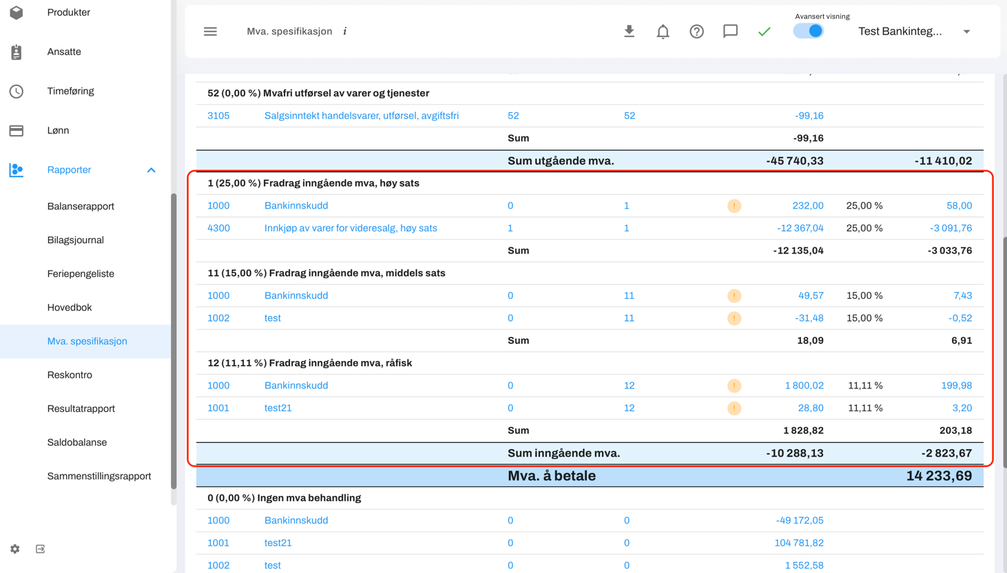 Rapporten viser kun de MVA-kodene som er brukt, og deretter kontoene som har minst én føring med den aktuelle MVA-koden i valgt periode. Hver MVA-kode har en egen oppsummering som viser totalbeløp for både grunnlag og MVA. Dersom en konto har føringer med flere ulike MVA-koder, vil den vises flere ganger – én gang under hver relevant MVA-kode.