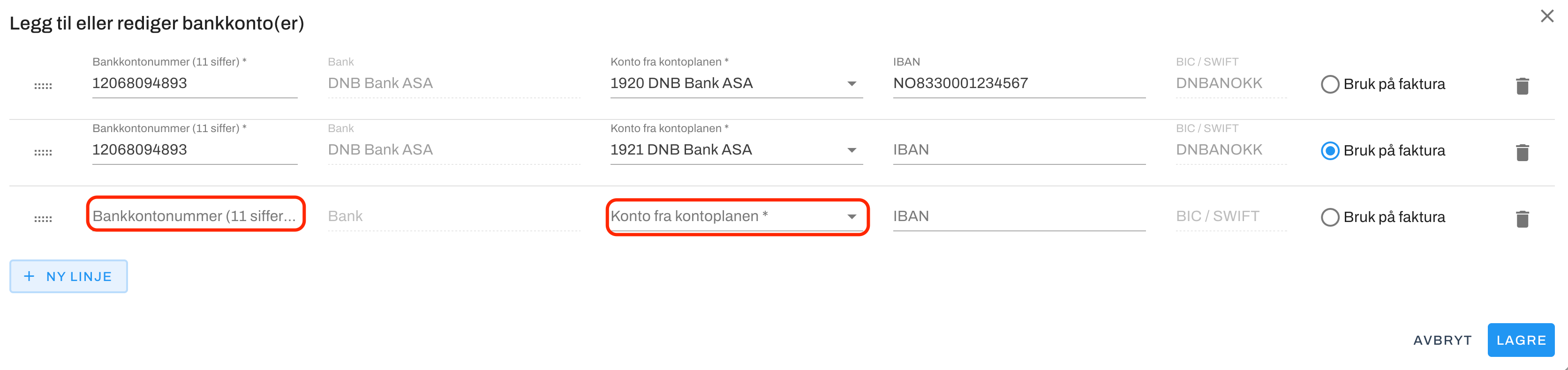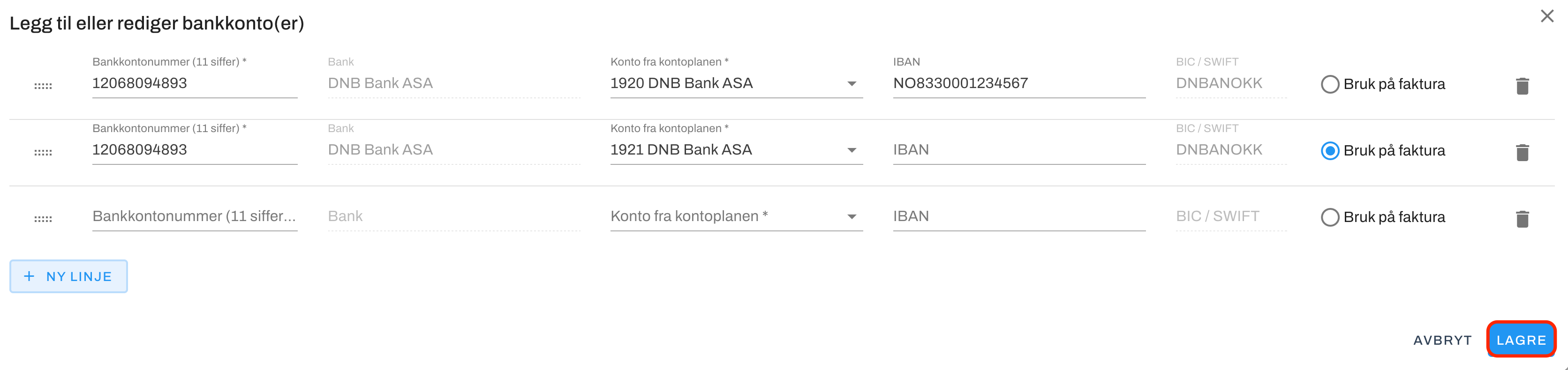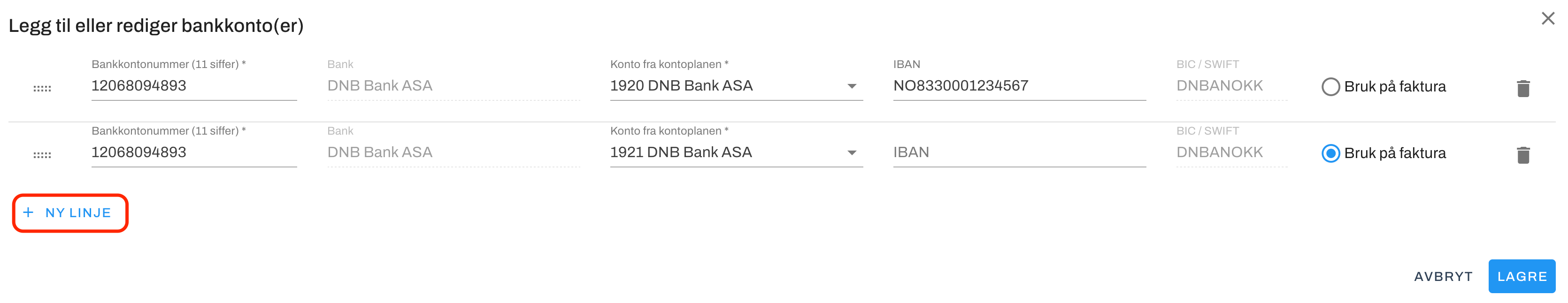 3. Dette åpner et nytt vindu hvor du kan redigere eller legge til bankkonto(er). Klikk på + NY LINJE for å legge inn nytt bankkontonummer.