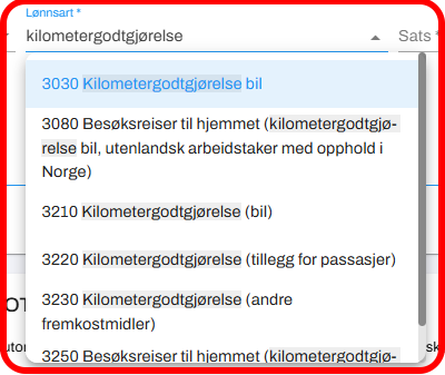 4. Velg lønnsart/type kilometergodtgjørelse.