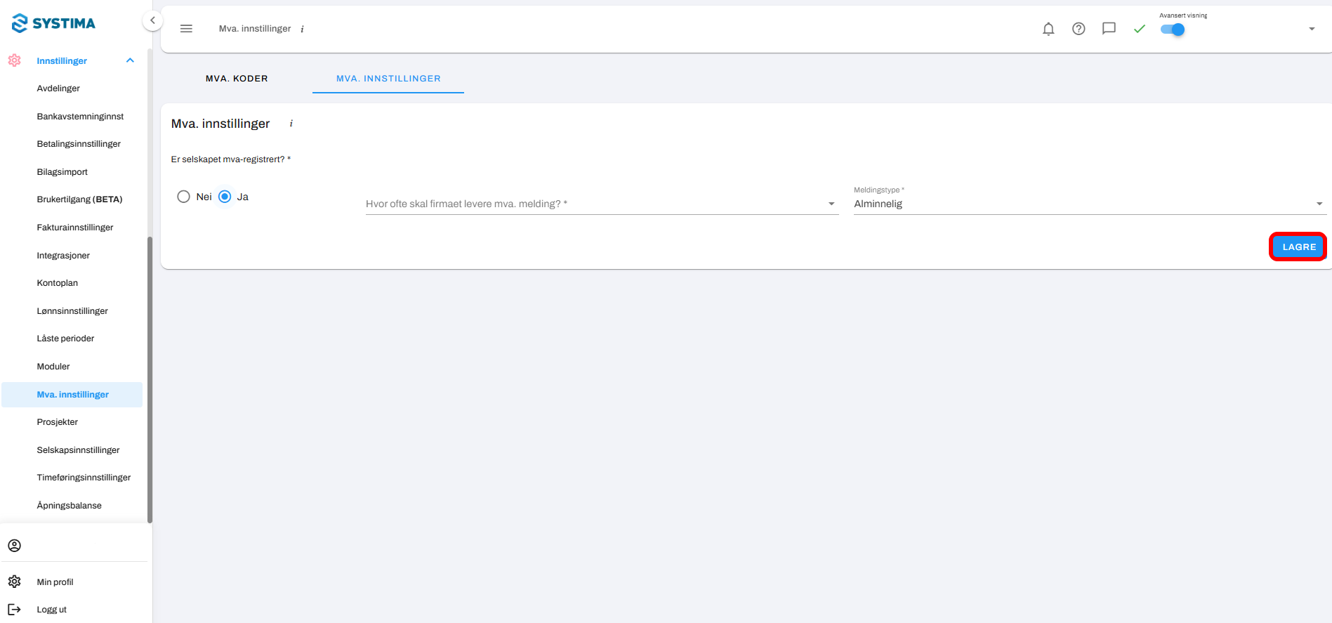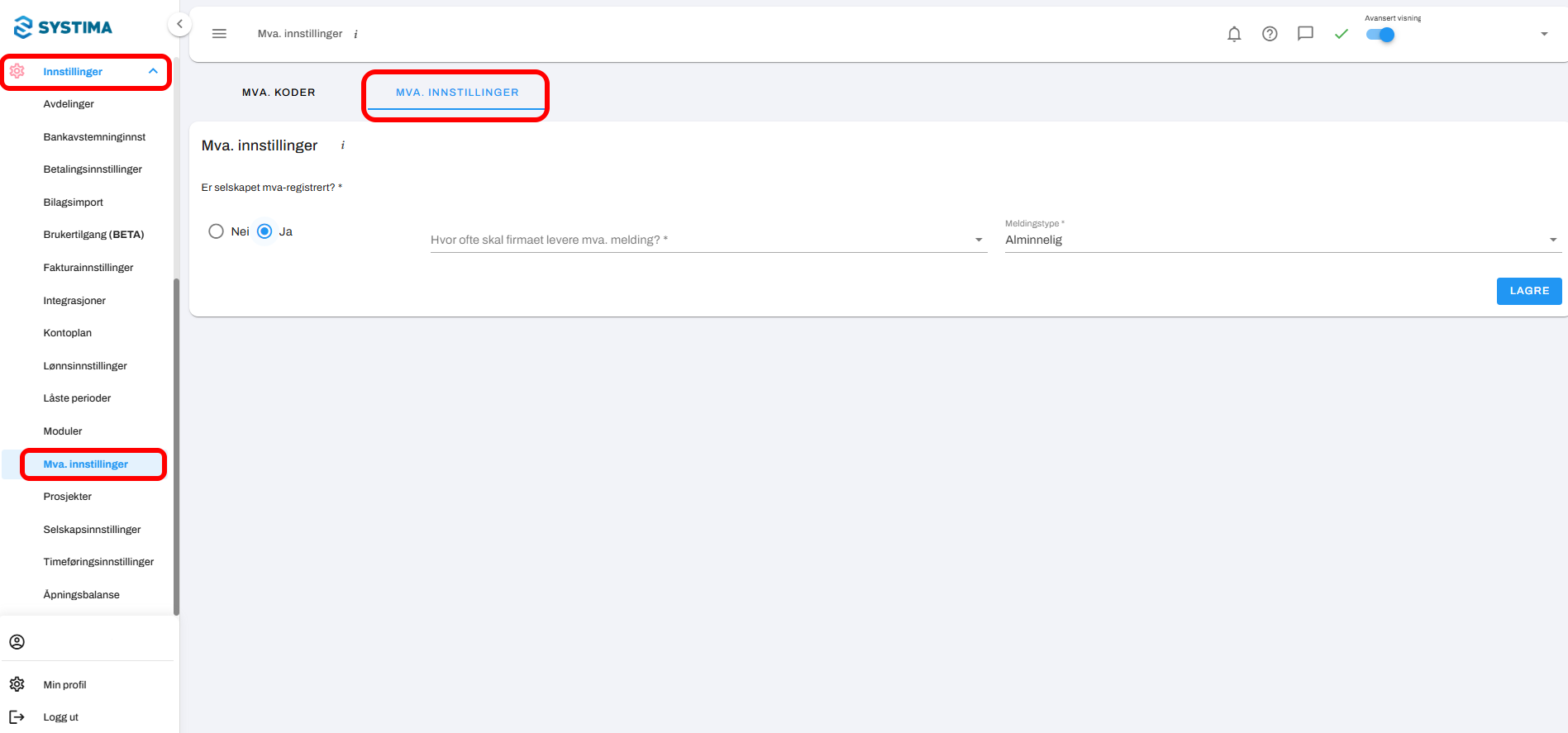 1. Logg inn i Systima → gå til Innstillinger → Mva. innstillinger, velg fanen for Mva. Innstillinger