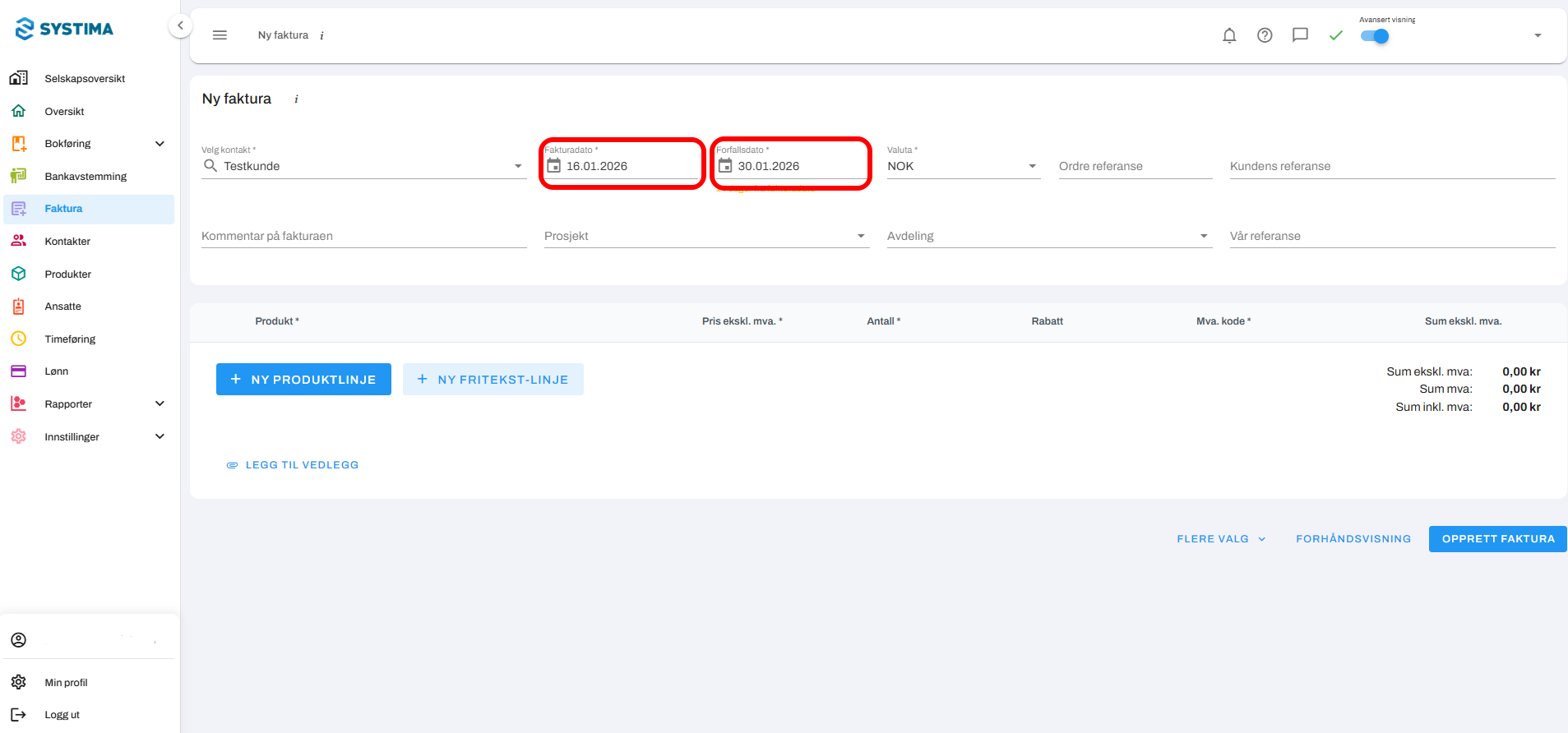 Fyll inn fakturadato og forfallsdato.