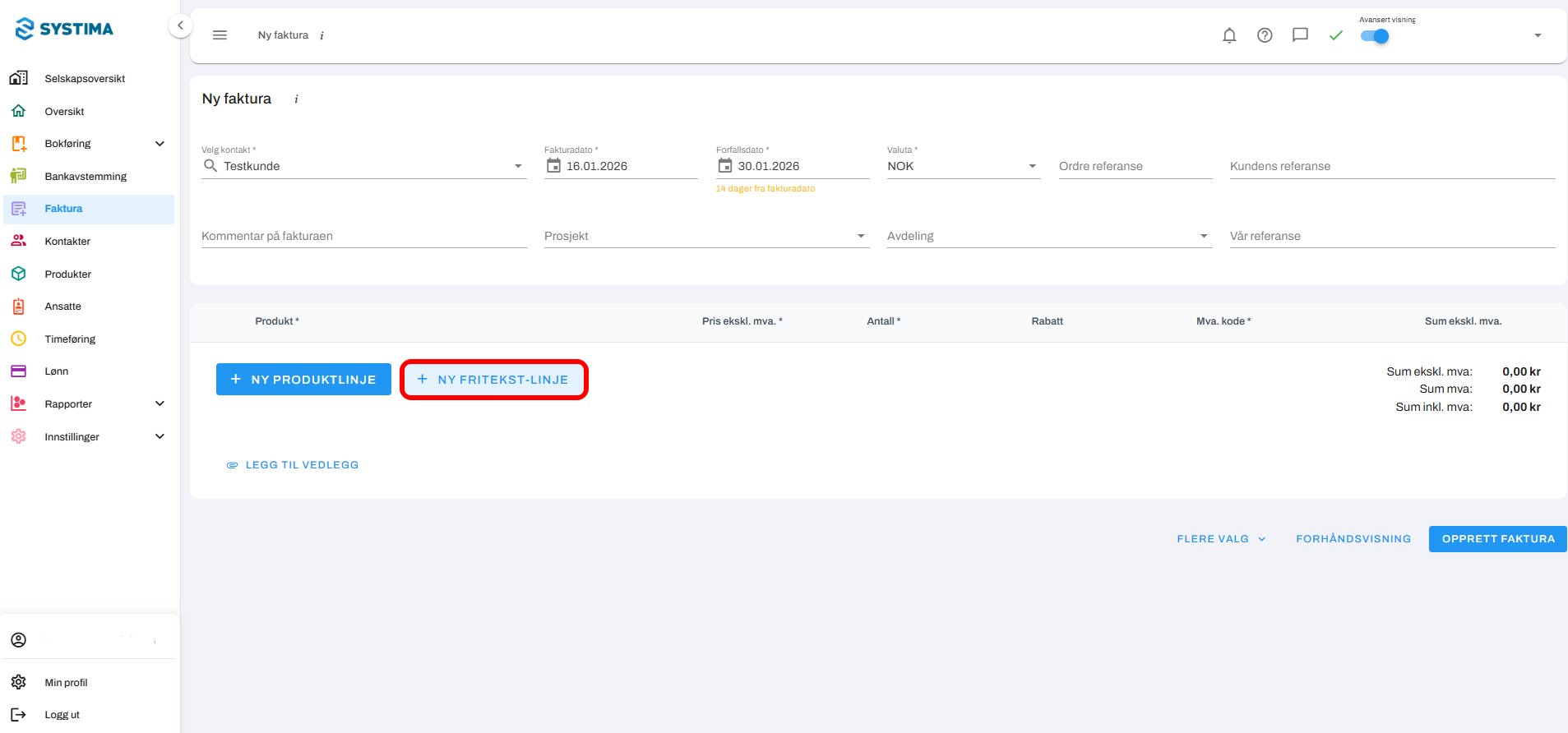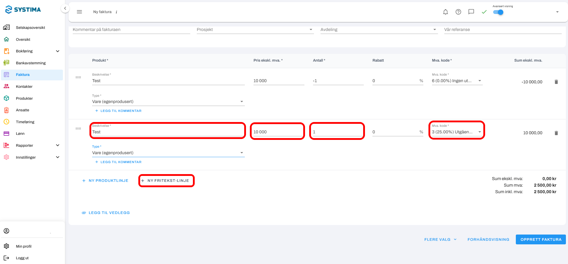 Legg deretter til en + Ny fritekstlinje med samme produkt og pris.