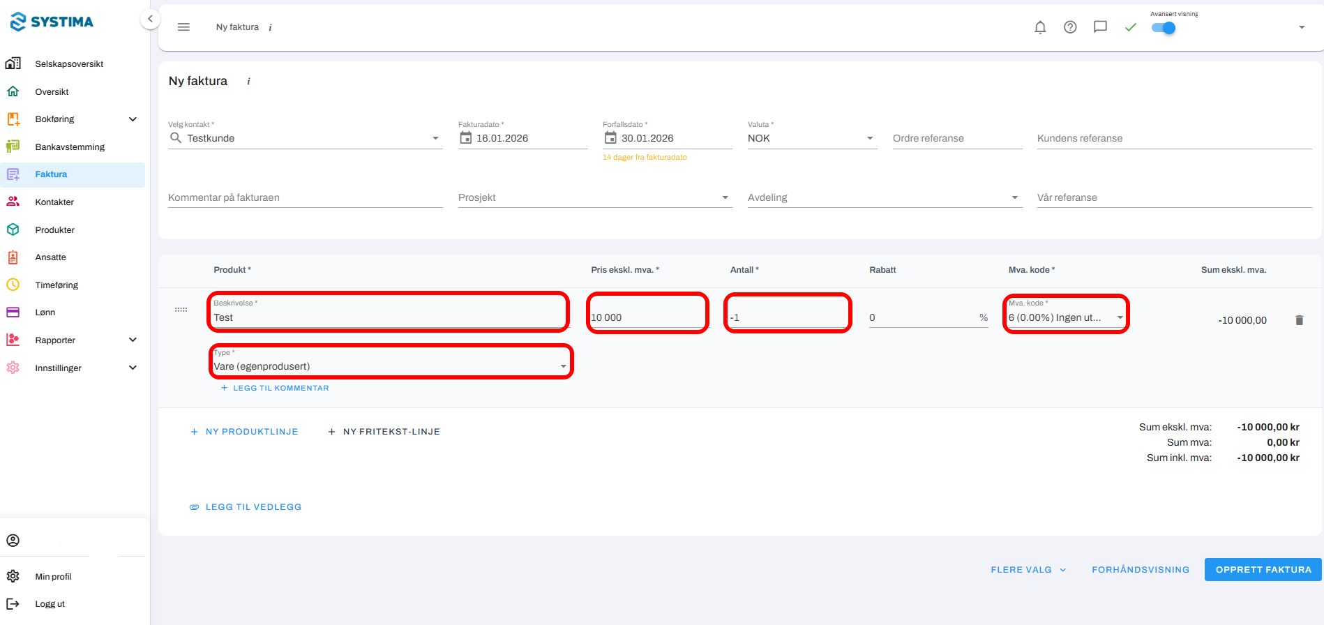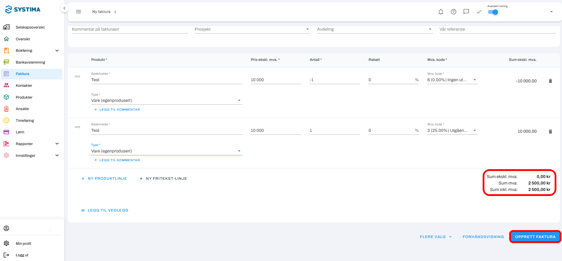 5. Klikk til slutt på Opprett faktura for å fullføre.