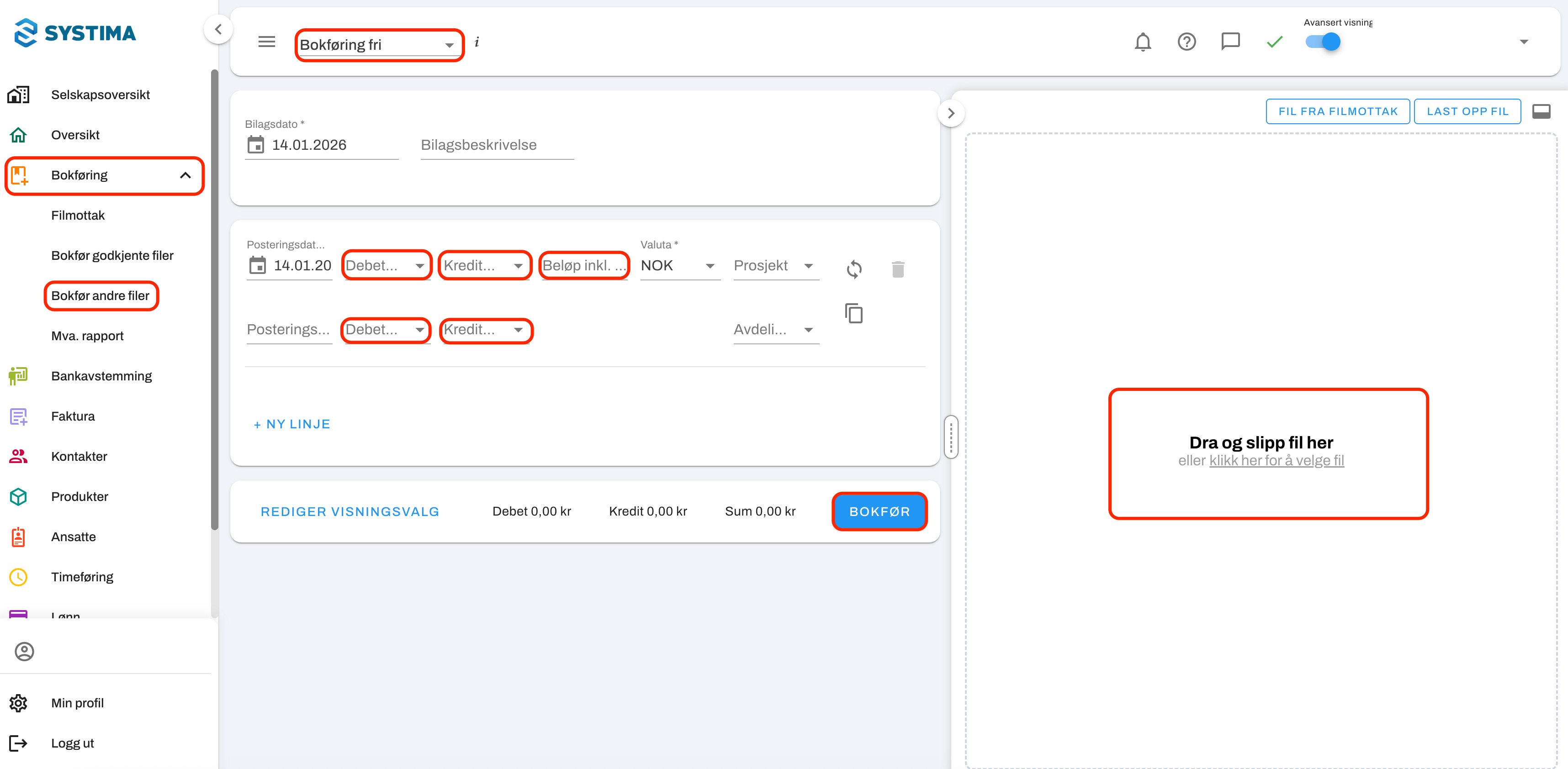 For å tapsføre en faktura må du føre det som et bilag i filmottaket. Dette gjør du ved å gå til Bokføring → Bokfør andre filer, og deretter velge Bokføring fri øverst til venstre, ved siden av menylinjen.