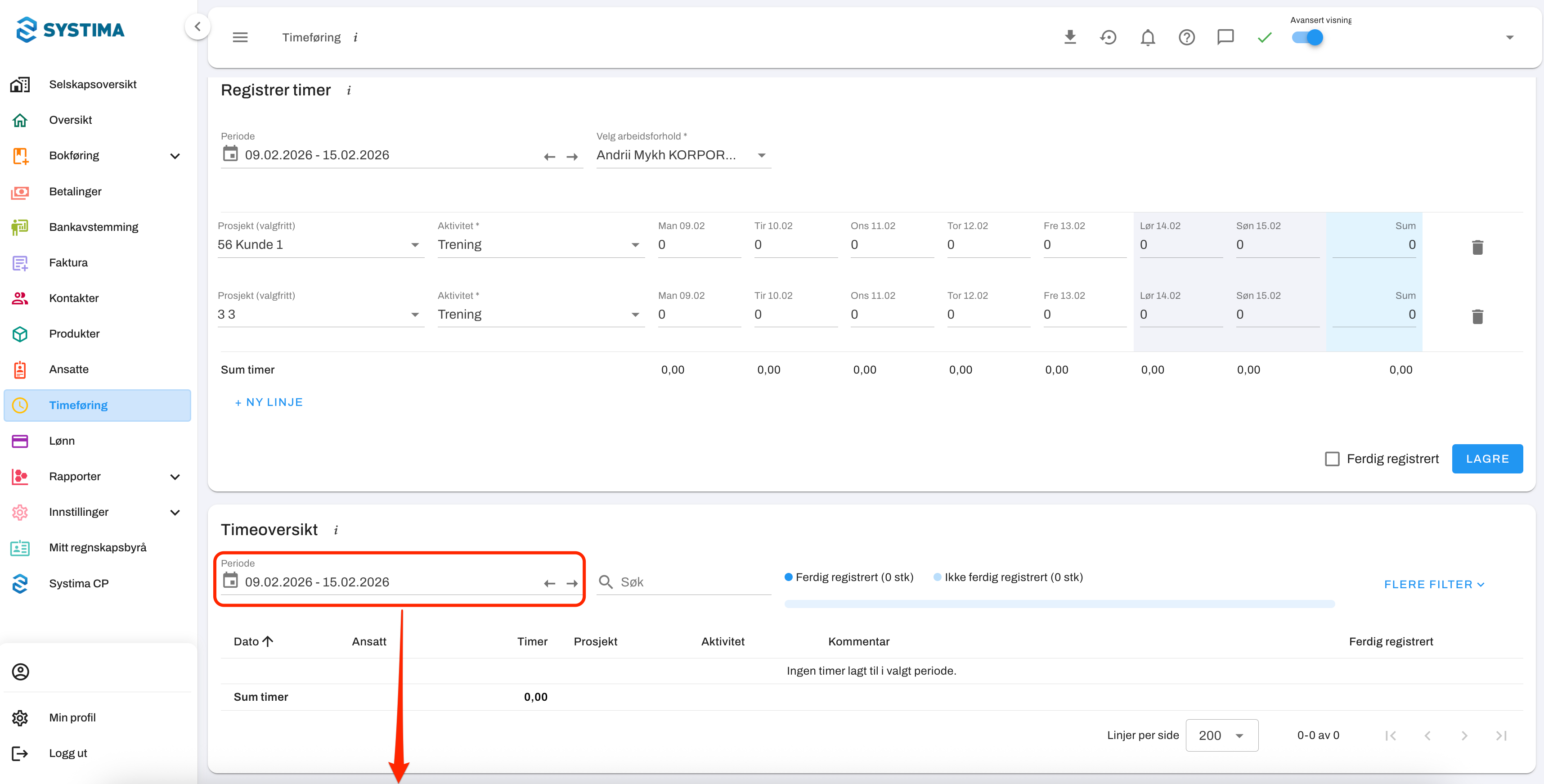 Du kan enkelt velge hvilken periode du ønsker å vise i timeoversikten. Dette kan være nyttig dersom du vil se, kontrollere eller registrere timer for en bestemt dag, uke, måned eller annen periode.