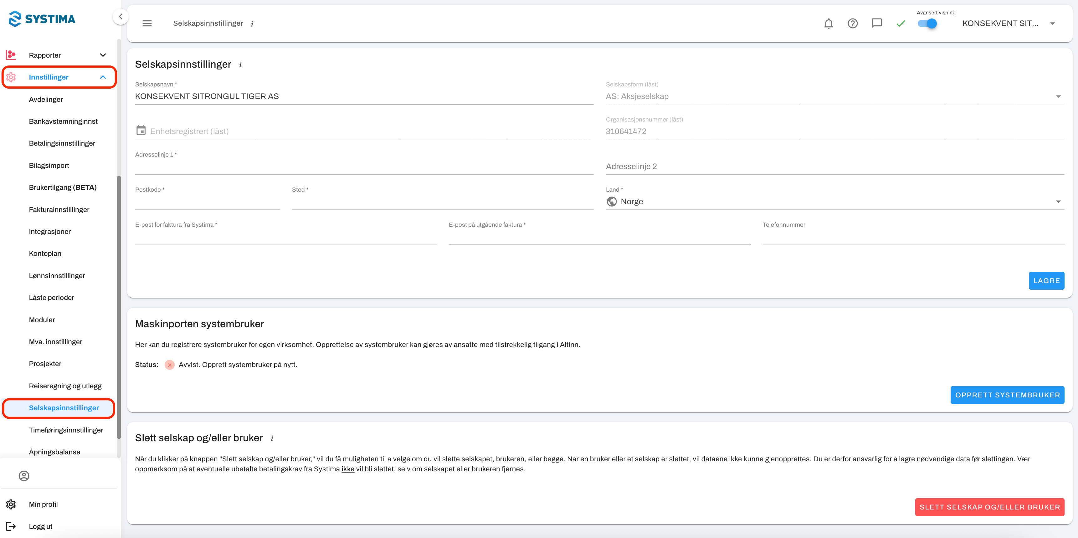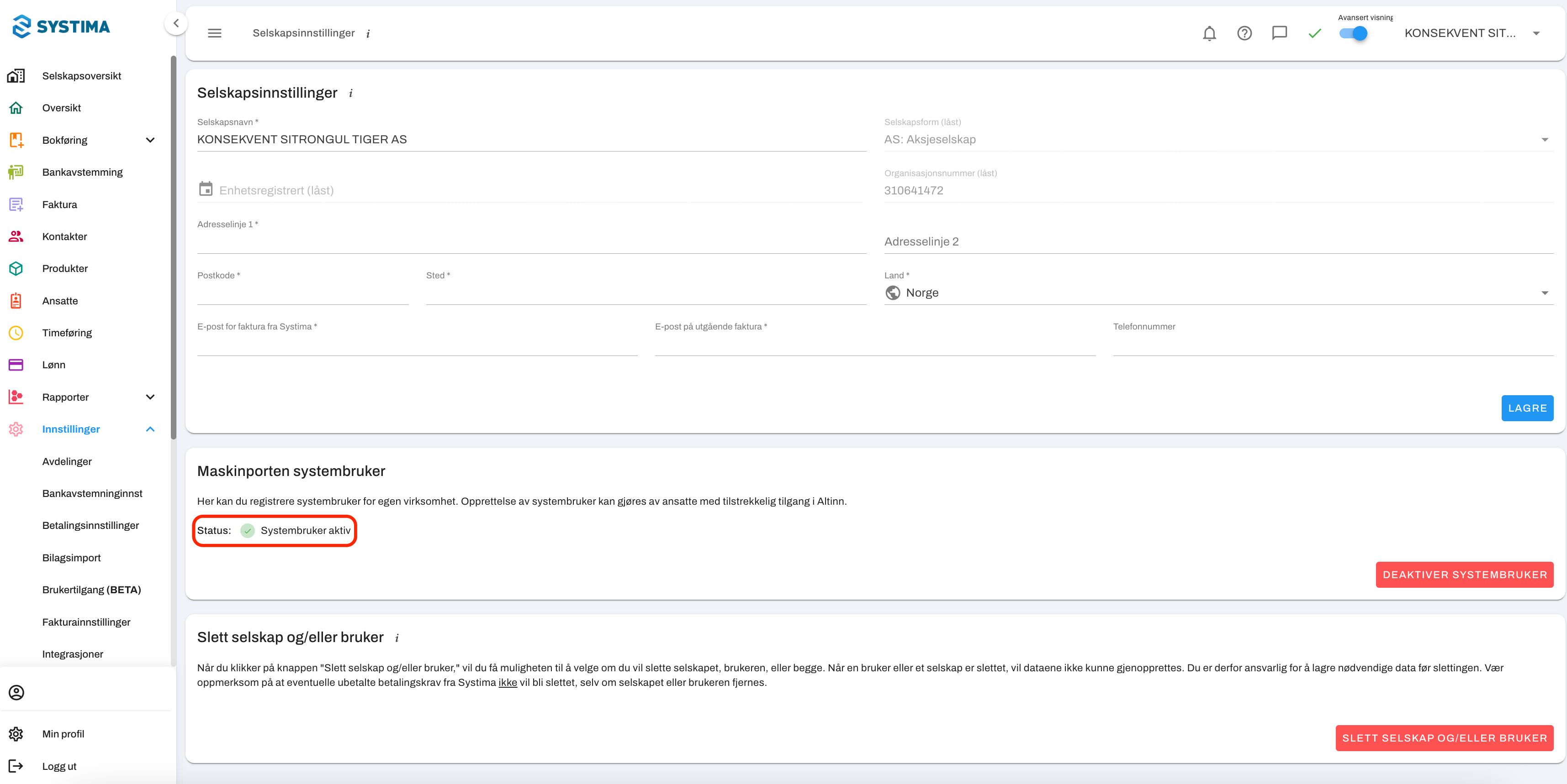 Når godkjenningen er fullført, sendes du tilbake til Systima. Du vil nå se at status viser systembruker aktiv. Integrasjonen er da aktiv, og Systima kan hente utleggstrekk via API.