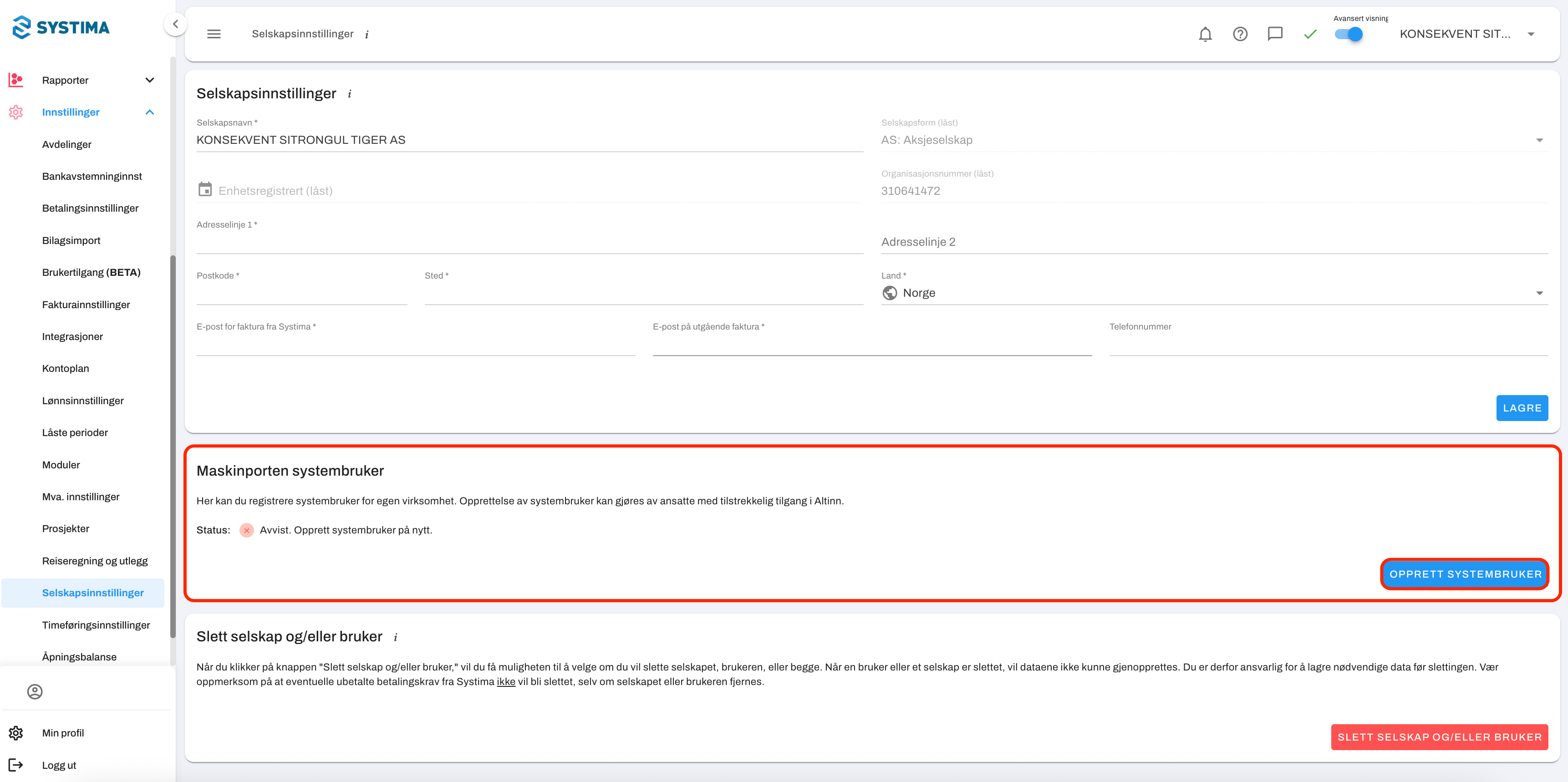 Klikk på "Opprett systembruker" i feltet "Maskinporten systembruker".
