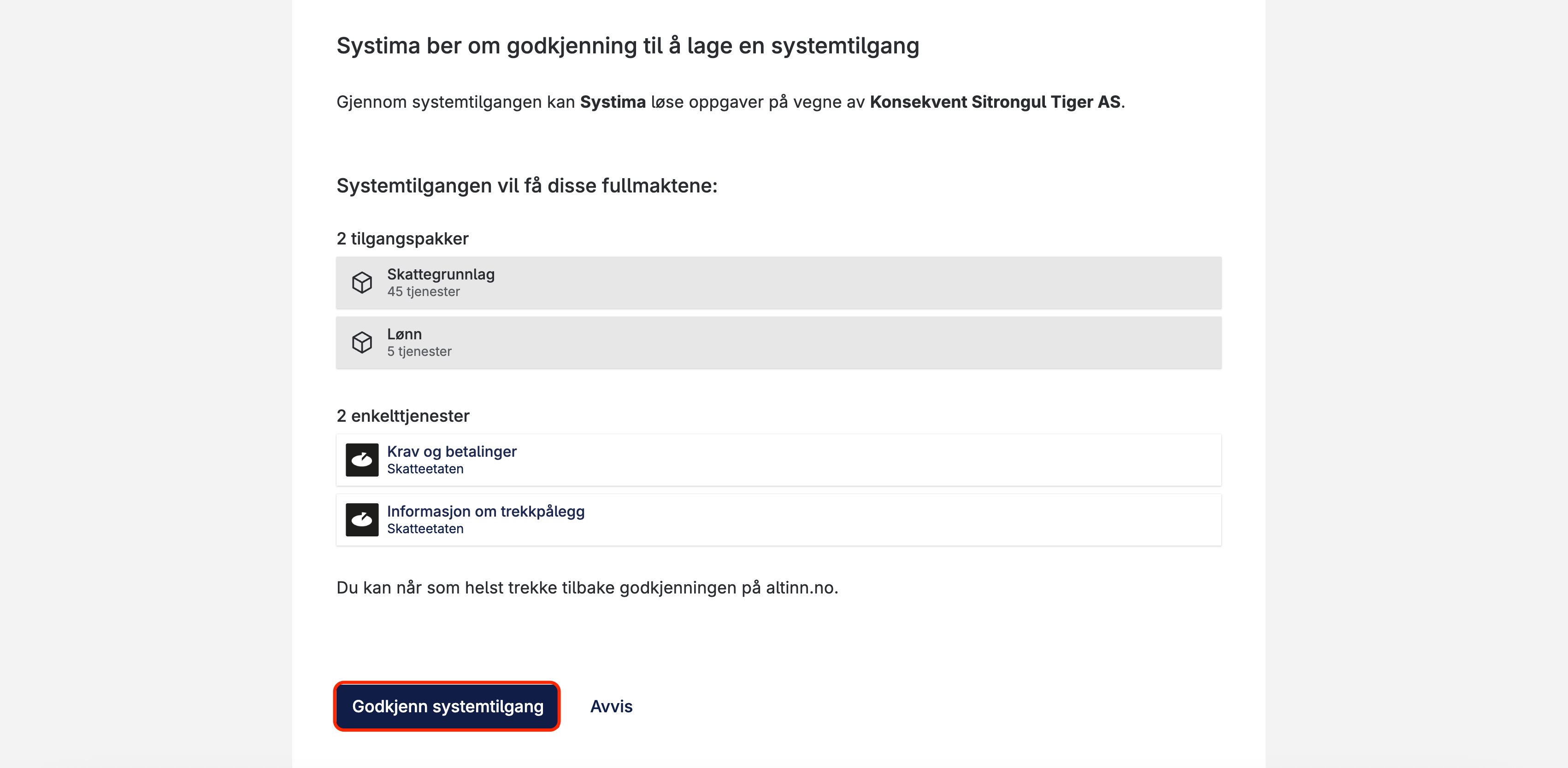 Du blir nå sendt videre til Altinn. Klikk på "Godkjenn systemtilgang".