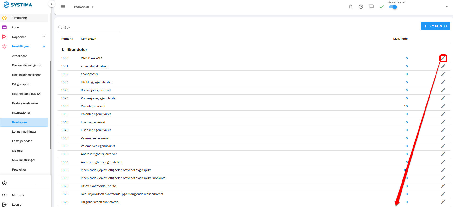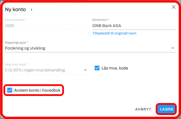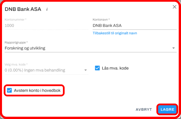 Klikk på redigeringsikonet til høyre i kontolinjen, og huk av for "Avstem konto i hovedbok".