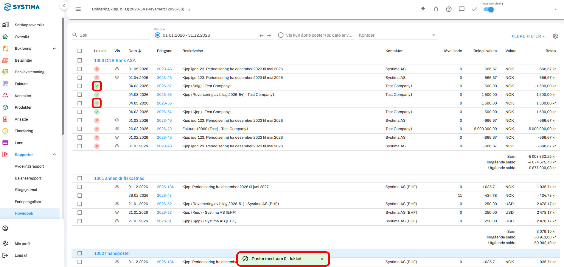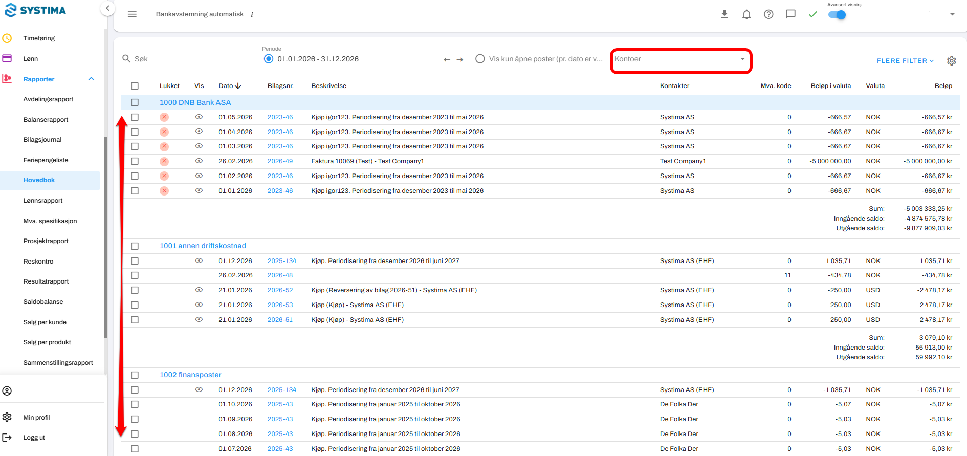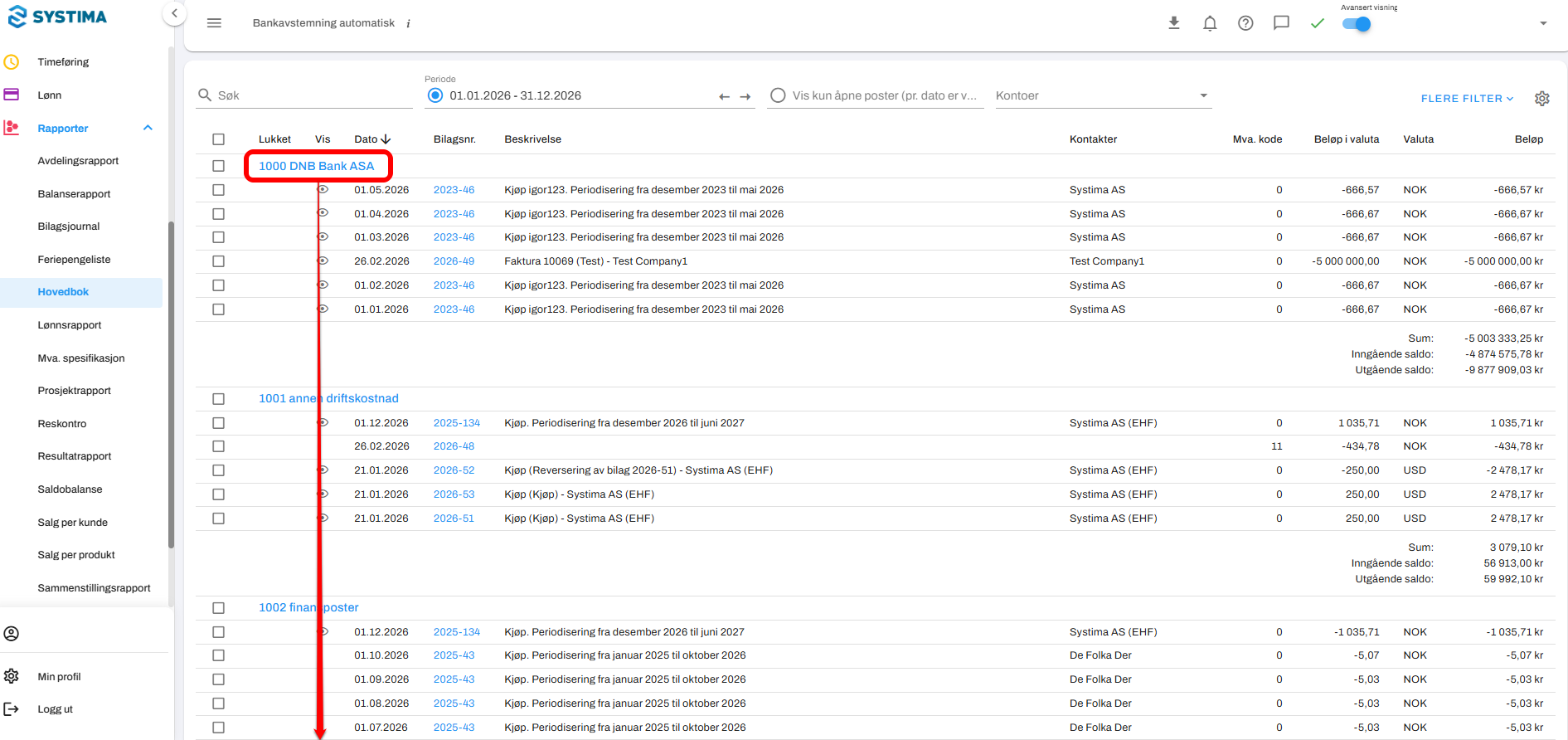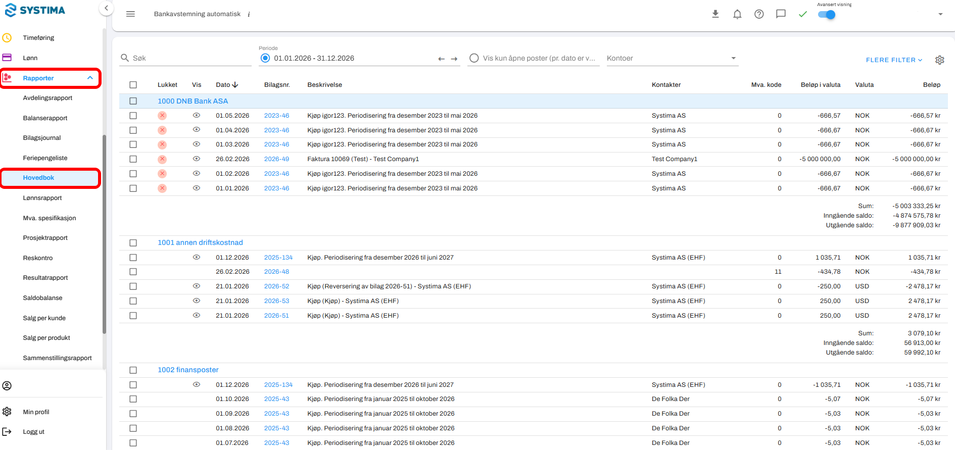 Gå til Rapporter → Hovedbok.