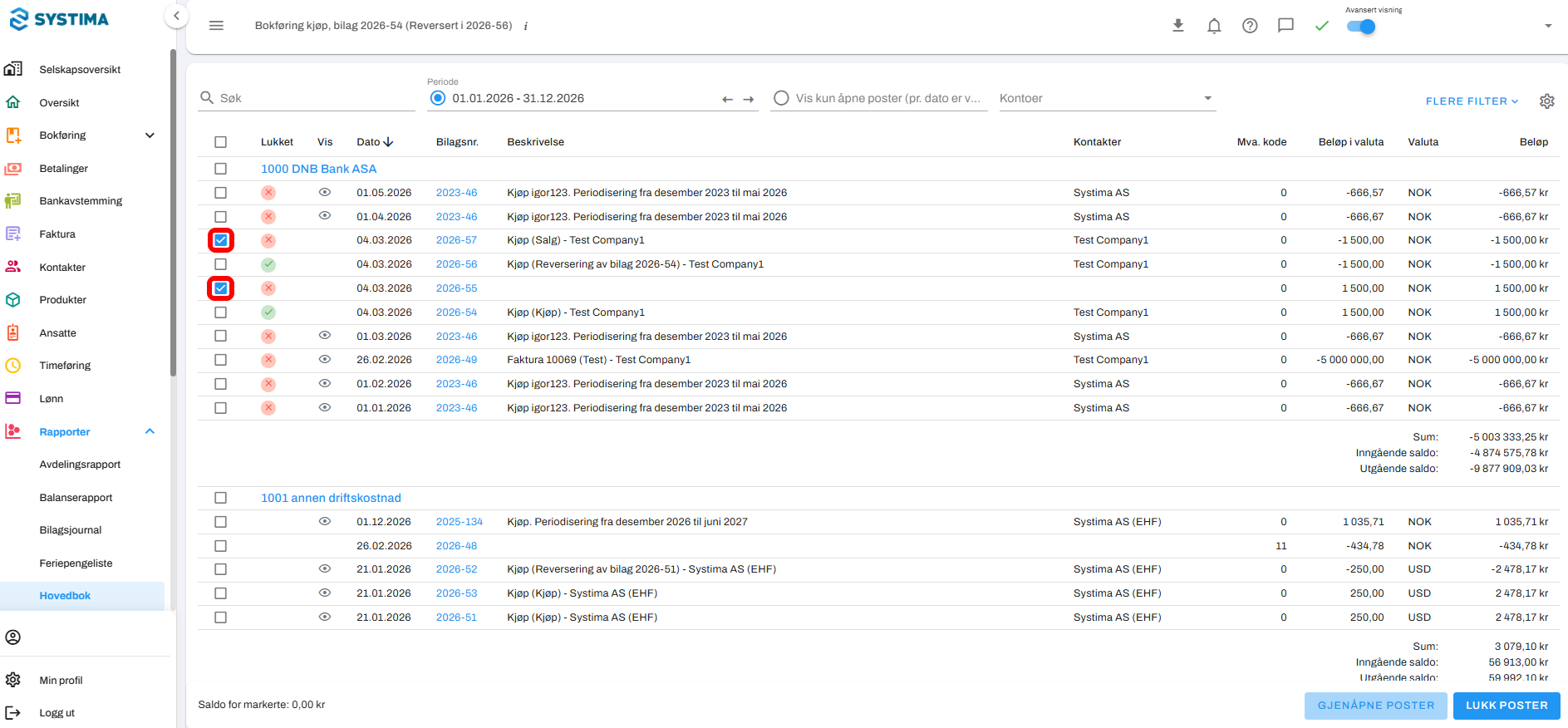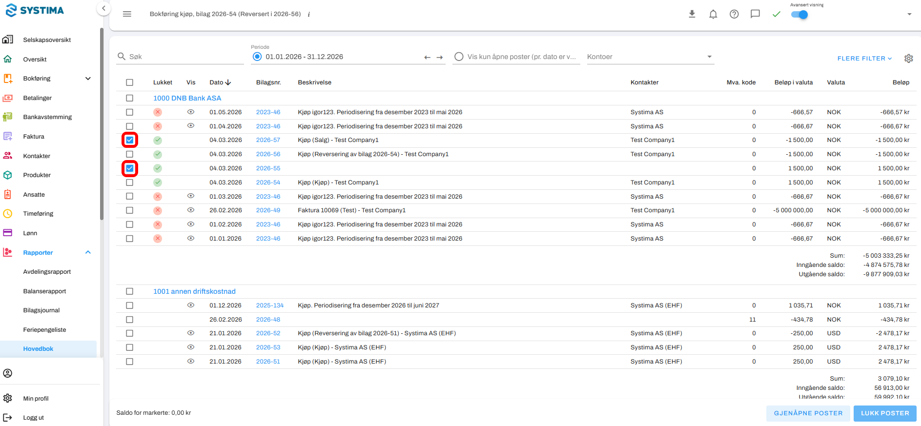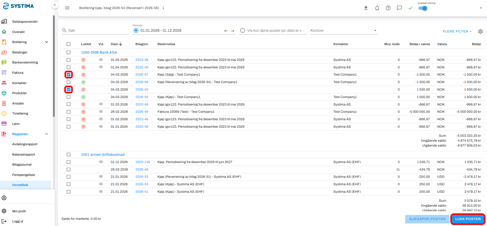 Marker linjene som skal lukkes mot hverandre ved å klikke i boksene til venstre i de aktuelle linjene. Du kan lukke en eller flere poster sammen, men de må gå i 0 for å kunne lukkes.