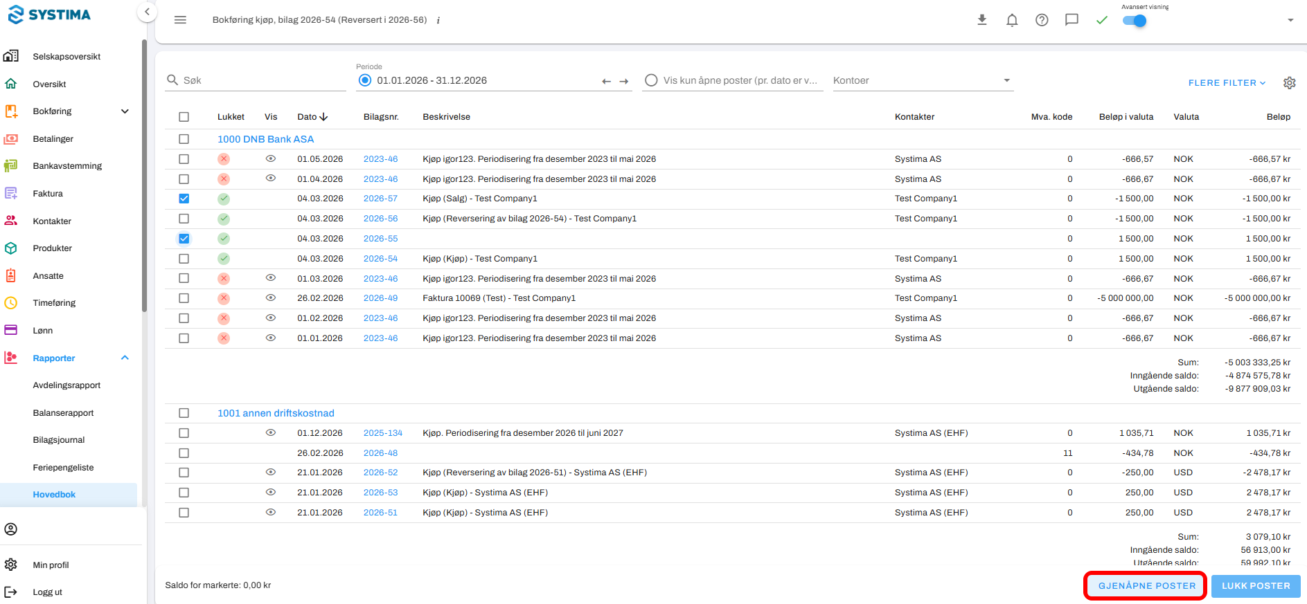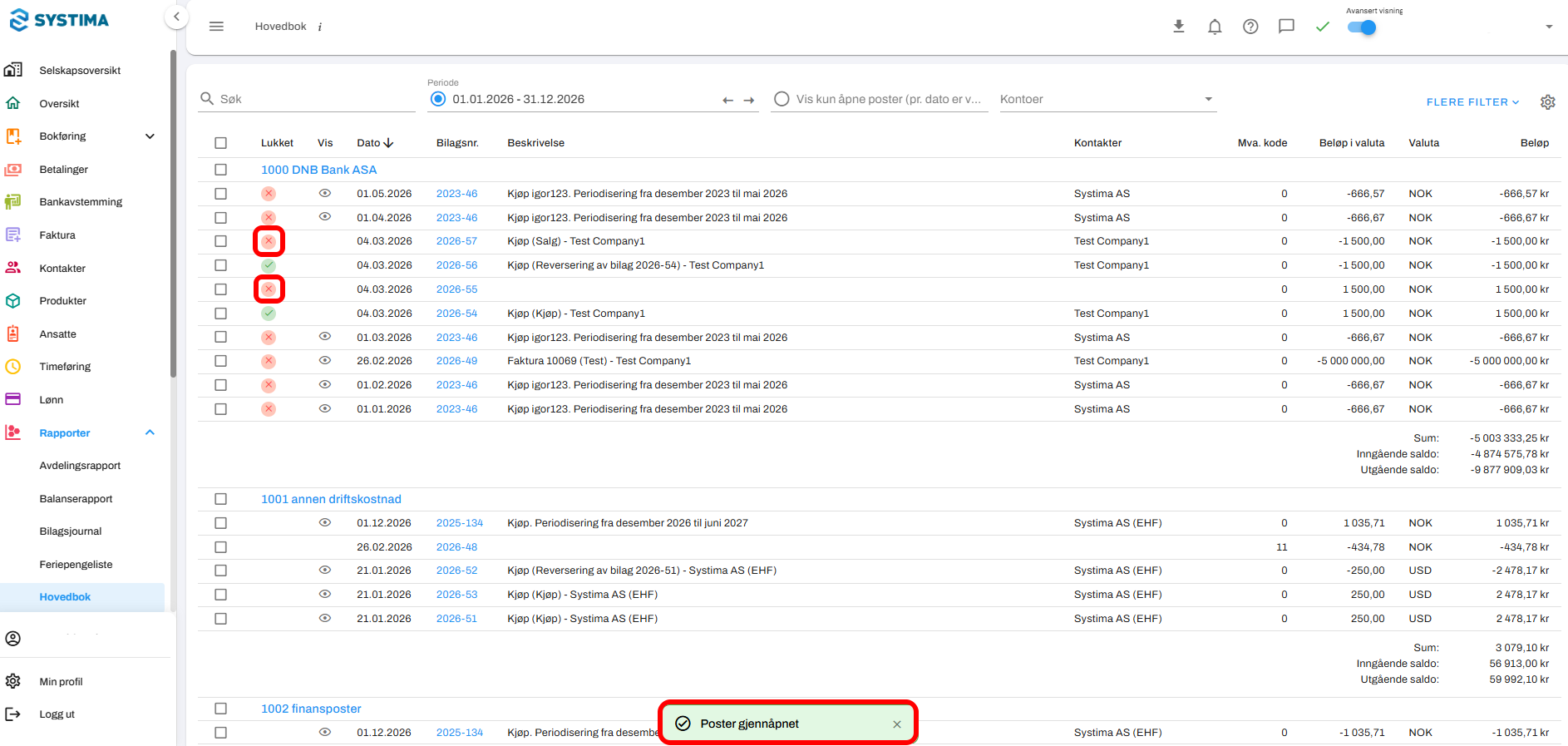 Dersom du har lukket feil poster, kan disse enkelt gjenåpnes.