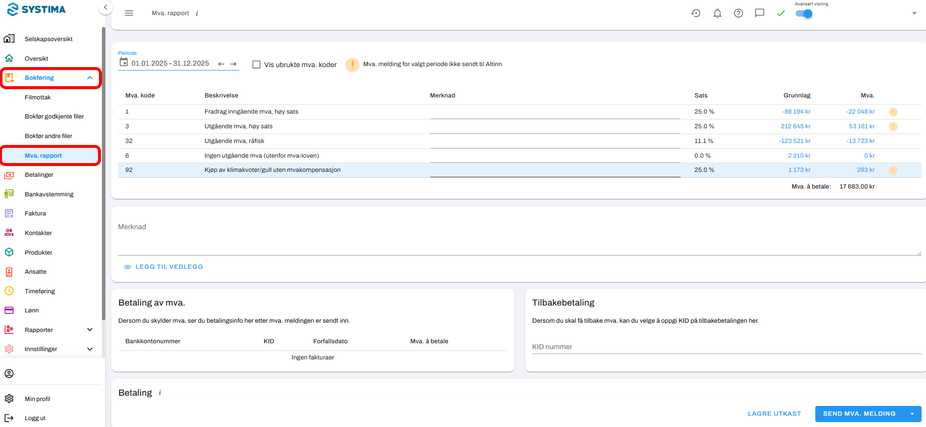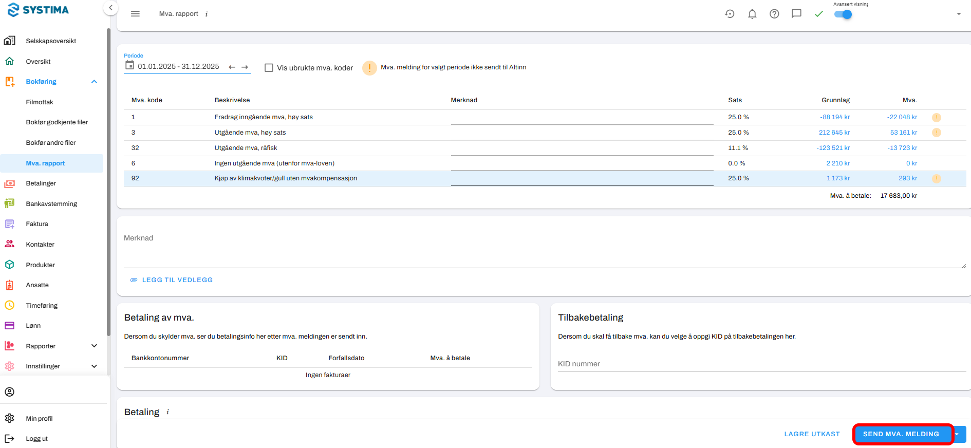 Når du sender inn mva-meldingen fra mva-rapporten, blir rapporten automatisk bokført og perioden lukket. Dette betyr at mva-grunnlaget overføres til regnskapet og meldingen sendes til myndighetene samtidig.
