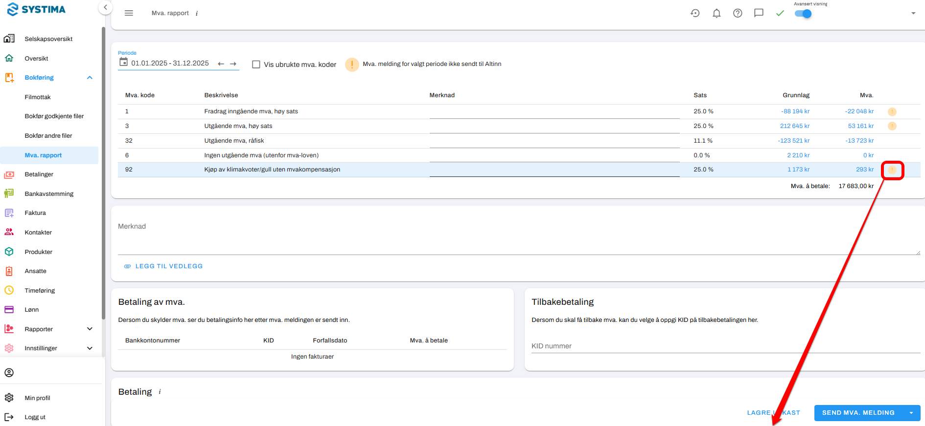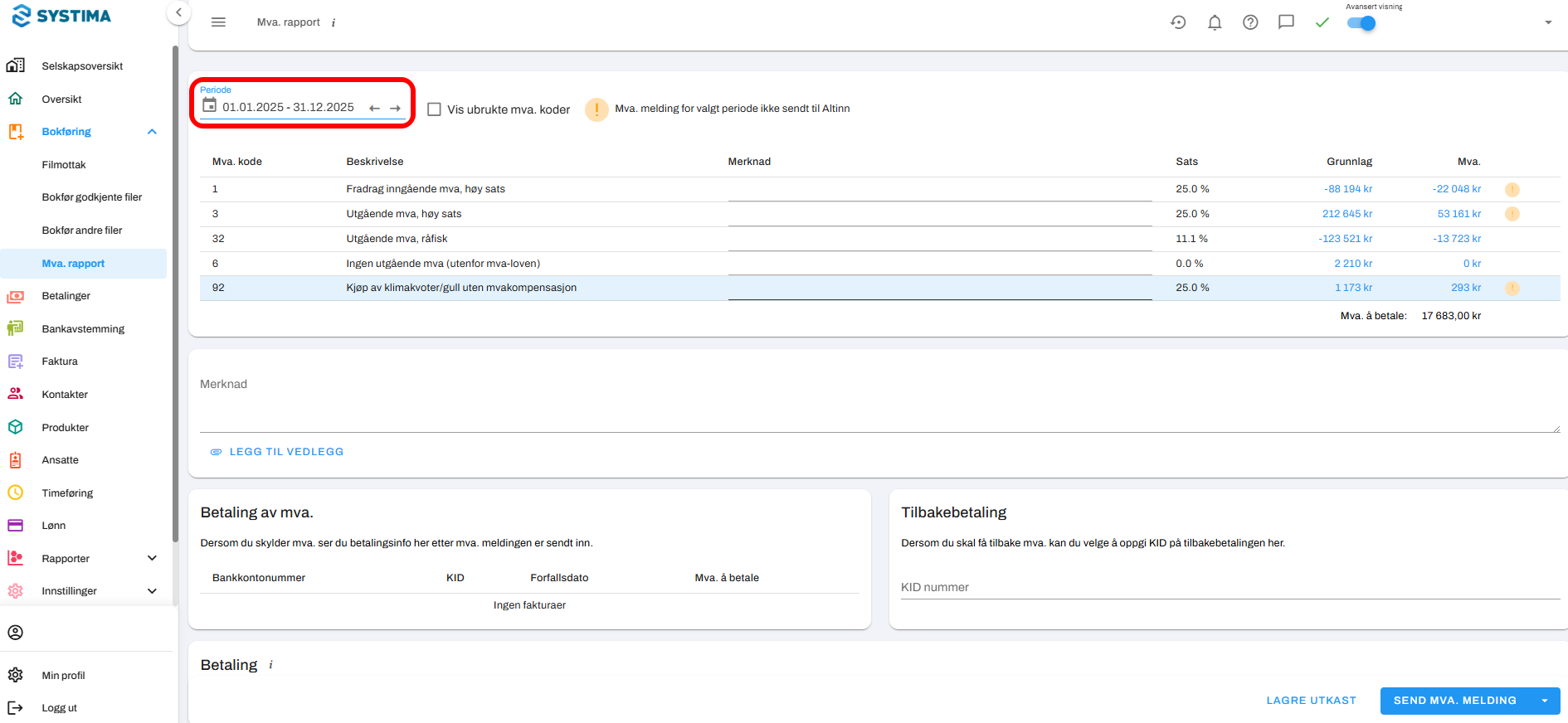 Når meldingen sendes, vil mva-rapporten bli bokført og lukket for den valgte perioden.