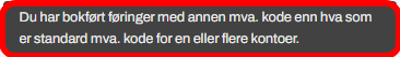 Dette betyr at systemet har oppdaget at en retningslinje er brutt, fordi det er bokført transaksjoner med en annen mva-kode enn det som er satt som standard mva-kode på kontoen.
