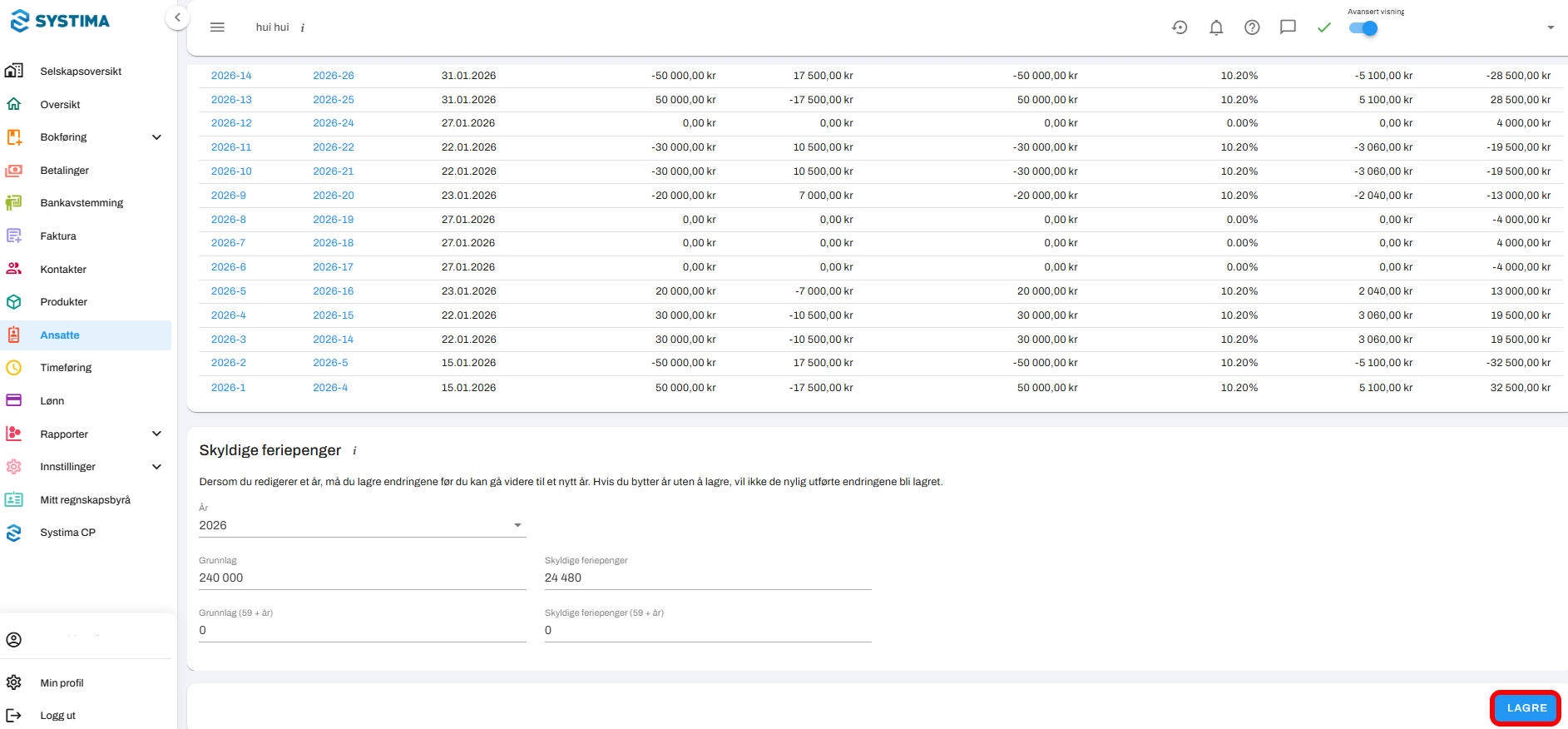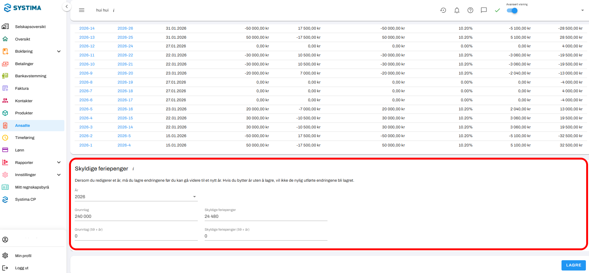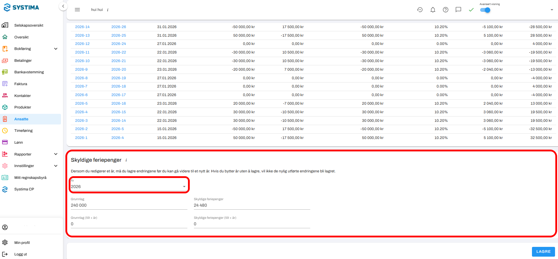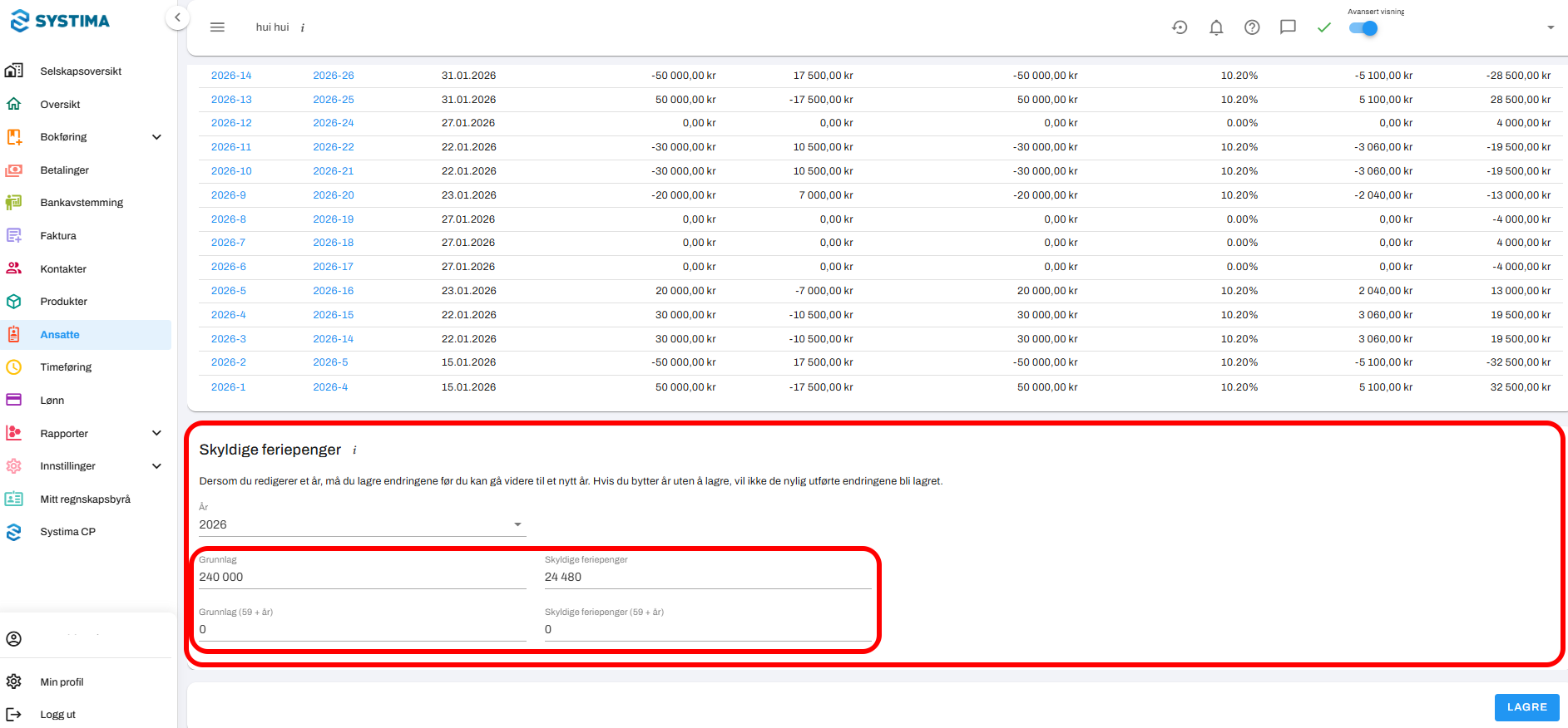 Dersom det er registrert skyldige feriepenger fra åpningsbalansen for et gitt år, vil systemet vise et eget felt for dette. Systemet vil i tillegg vise et ekstra felt som viser den totale summen av påløpte feriepenger (skyldige feriepenger registerert i Systima + skyldige feriepenger fra åpningsbalansen).