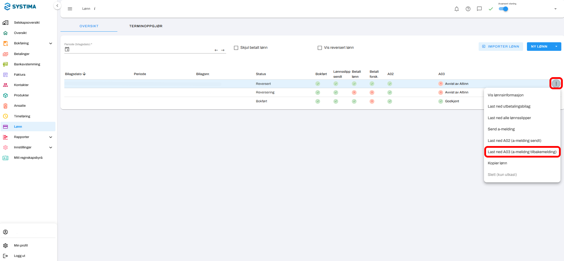 Når du får tilbakemelding på a-meldingen med status "Avvist av Altinn, Mottatt, med feil" eller "Mottatt, må kontrolleres", kan du se mer informasjon om feilen direkte i systemet.