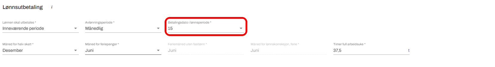 Hvis du setter betalingsdato til 15., vil lønnen bli utbetalt den 15. i inneværende måned.