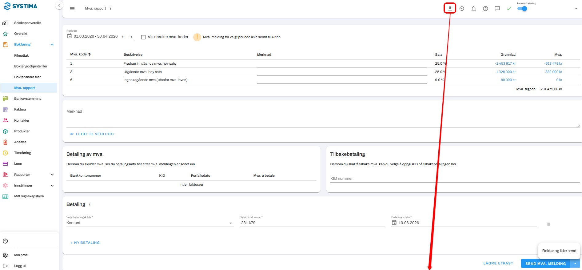 - Når mva-meldingen er bokført, klikker du på nedlastingsikonet øverst til høyre i menylinjen.