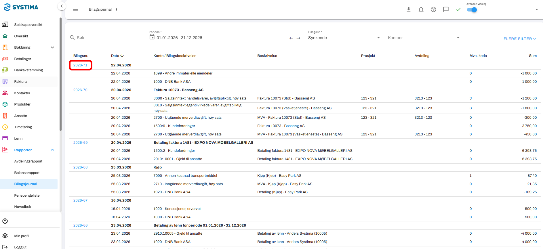- Dette kan du gjøre i hovedbok, bilagsjournal, eller andre rapporter hvor bilagsnummeret vises som en blå lenke
