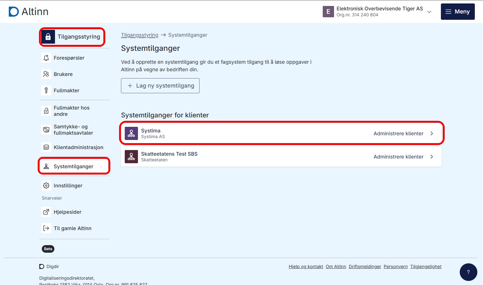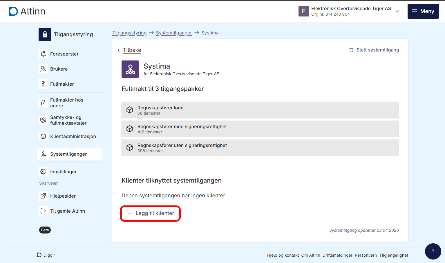 For at Systima skal kunne hente og sende data på vegne av klientene dine, må du gi systemtilgang i Altinn.